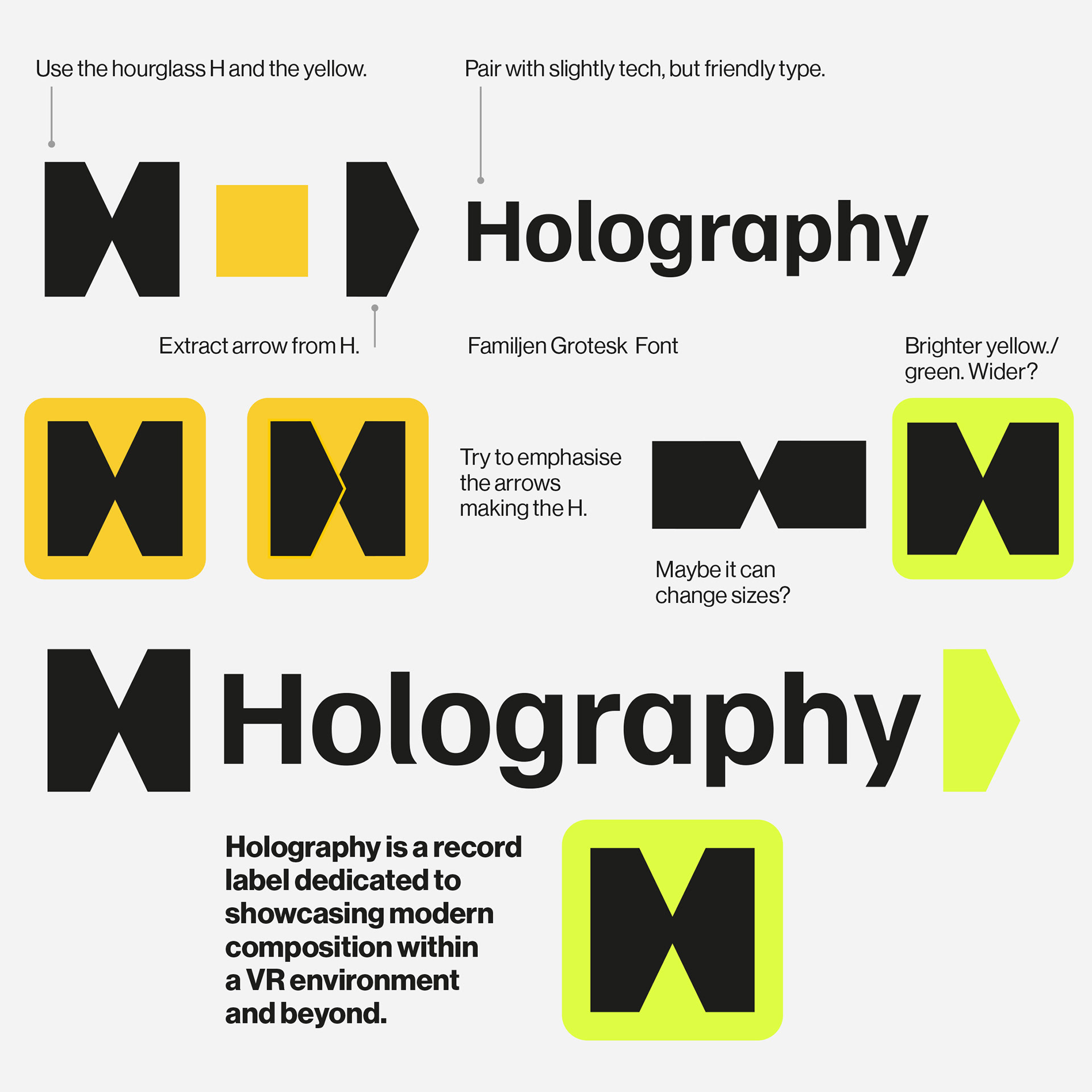I created a dynamic identity inspired by the directional arrows in the VR environment, which intersect to form the letter ‘H’. The logo is adaptable, able to morph in size and break into two arrows, with space for imagery. The branding system was designed for flexibility across digital, print, and immersive platforms, with motion elements reflecting the label’s interactive qualities. The result is a cohesive, forward-thinking visual identity that aligns with Holography’s innovative and evolving approach.