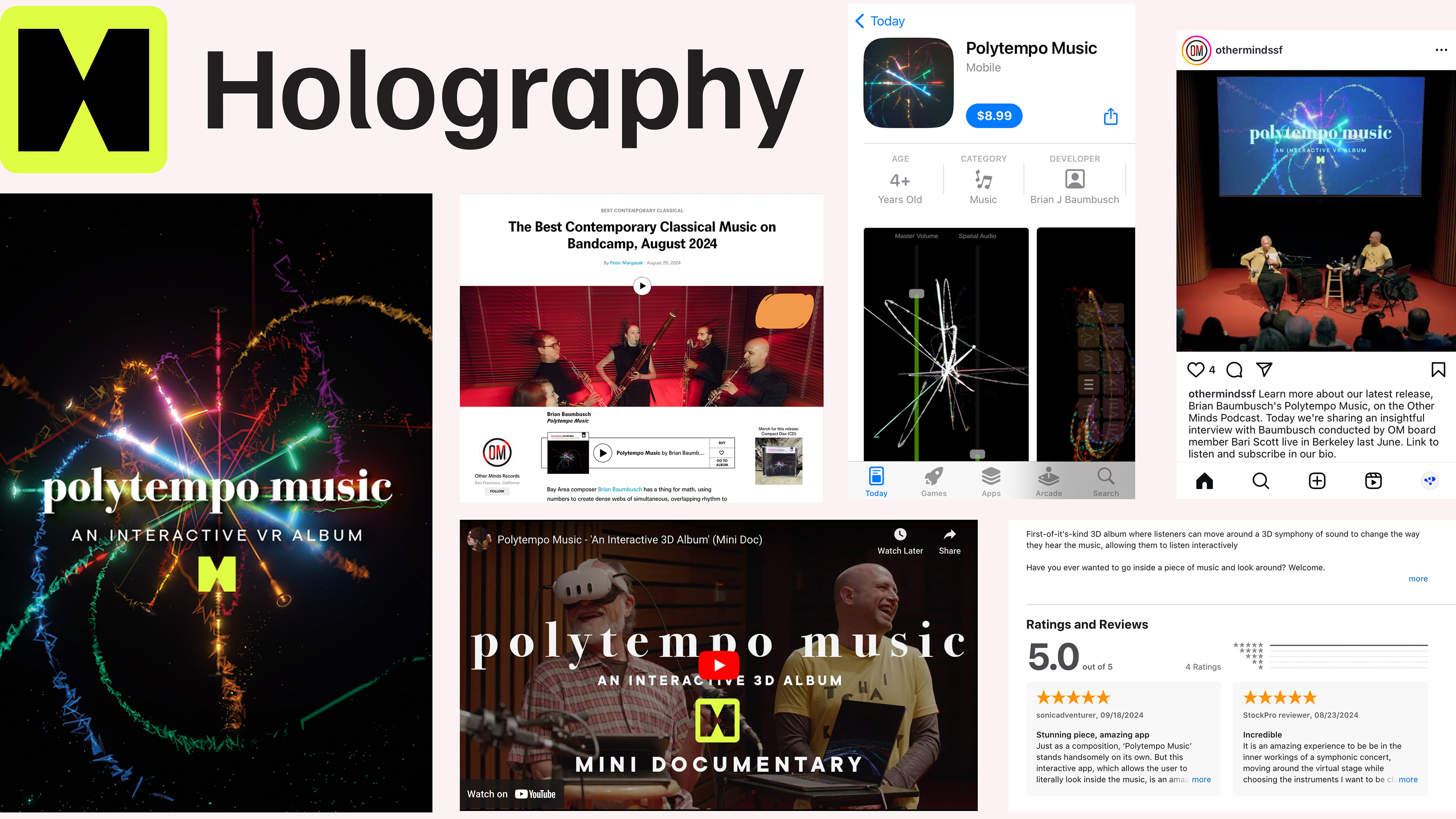 Composer Brian Baumbusch needed an identity for his record label, Holography, founded to release his immersive album and app, 'Polytempo Music'. The label showcases modern compositions in a VR environment, with 'Polytempo Music' as its first release.