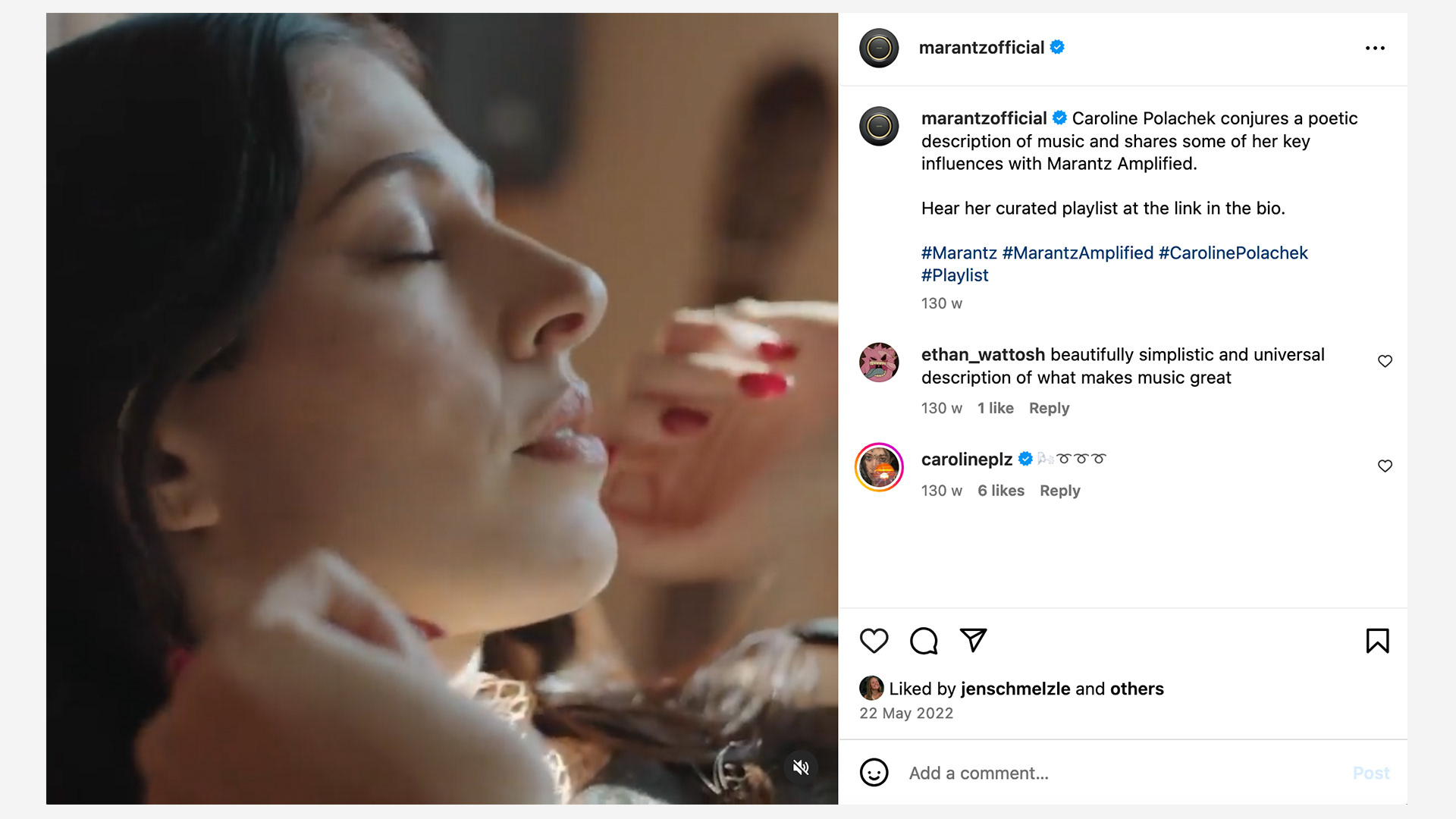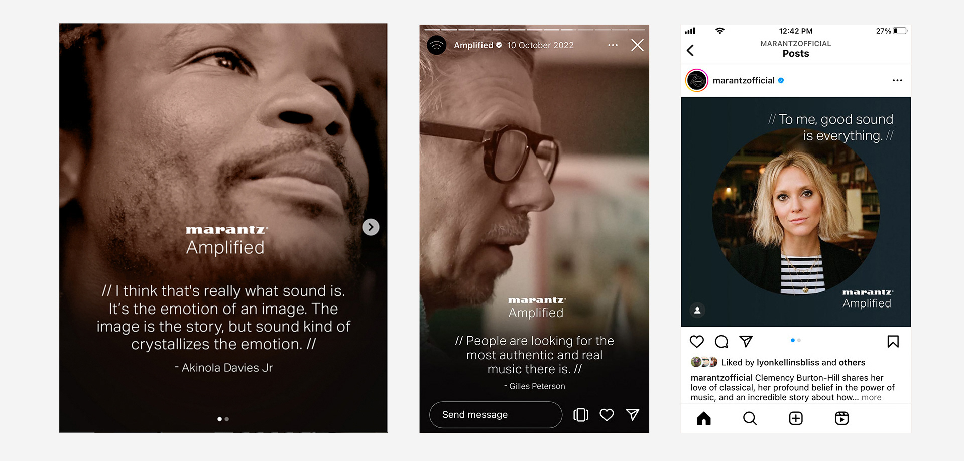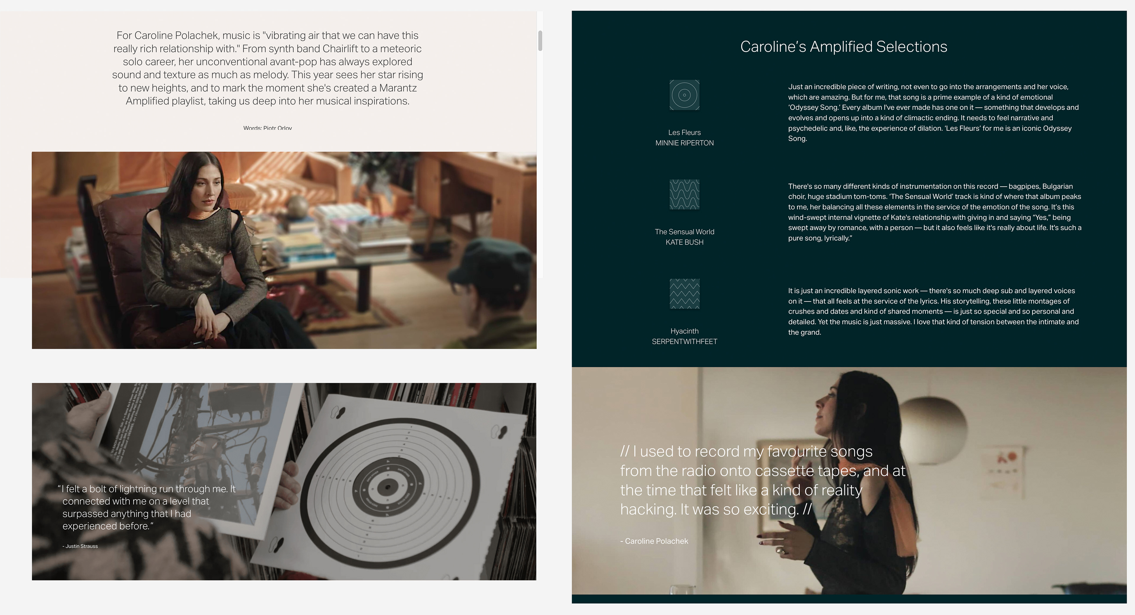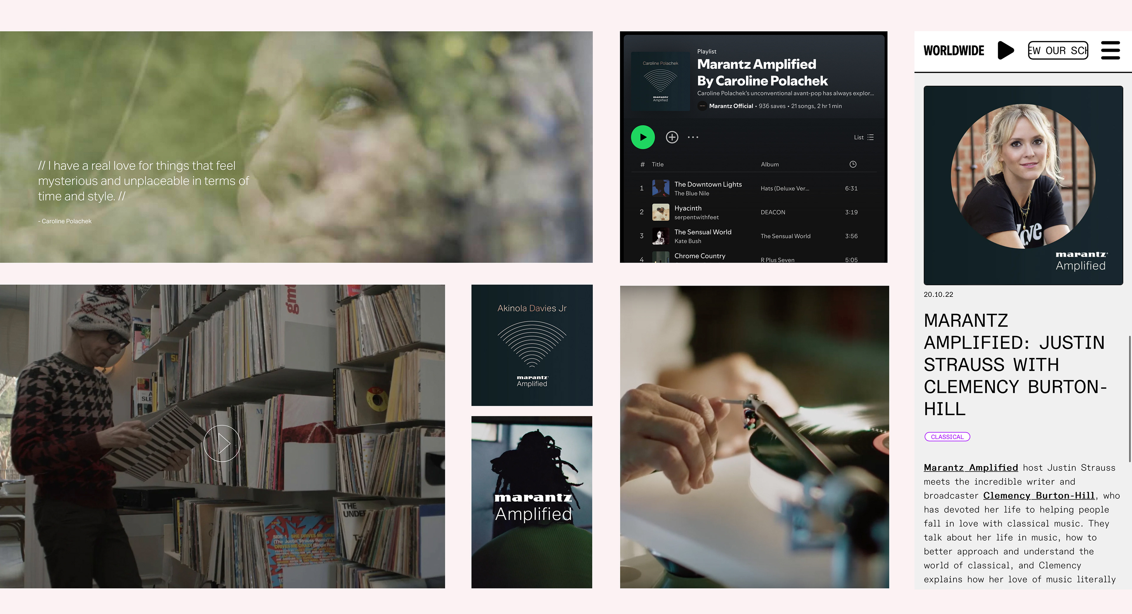 To position Marantz within the cultural sphere and attract new audiences, this campaign was developed in partnership with Pitch N Sync. The campaign was designed as an editorial series, paired with either a playlist or podcast. Featured in the series were DJ Justin Strauss, singer/artist Caroline Polachek, DJ Gilles Peterson, filmmaker Akinola Davies Jnr, and broadcaster Clemency Burton-Hill.